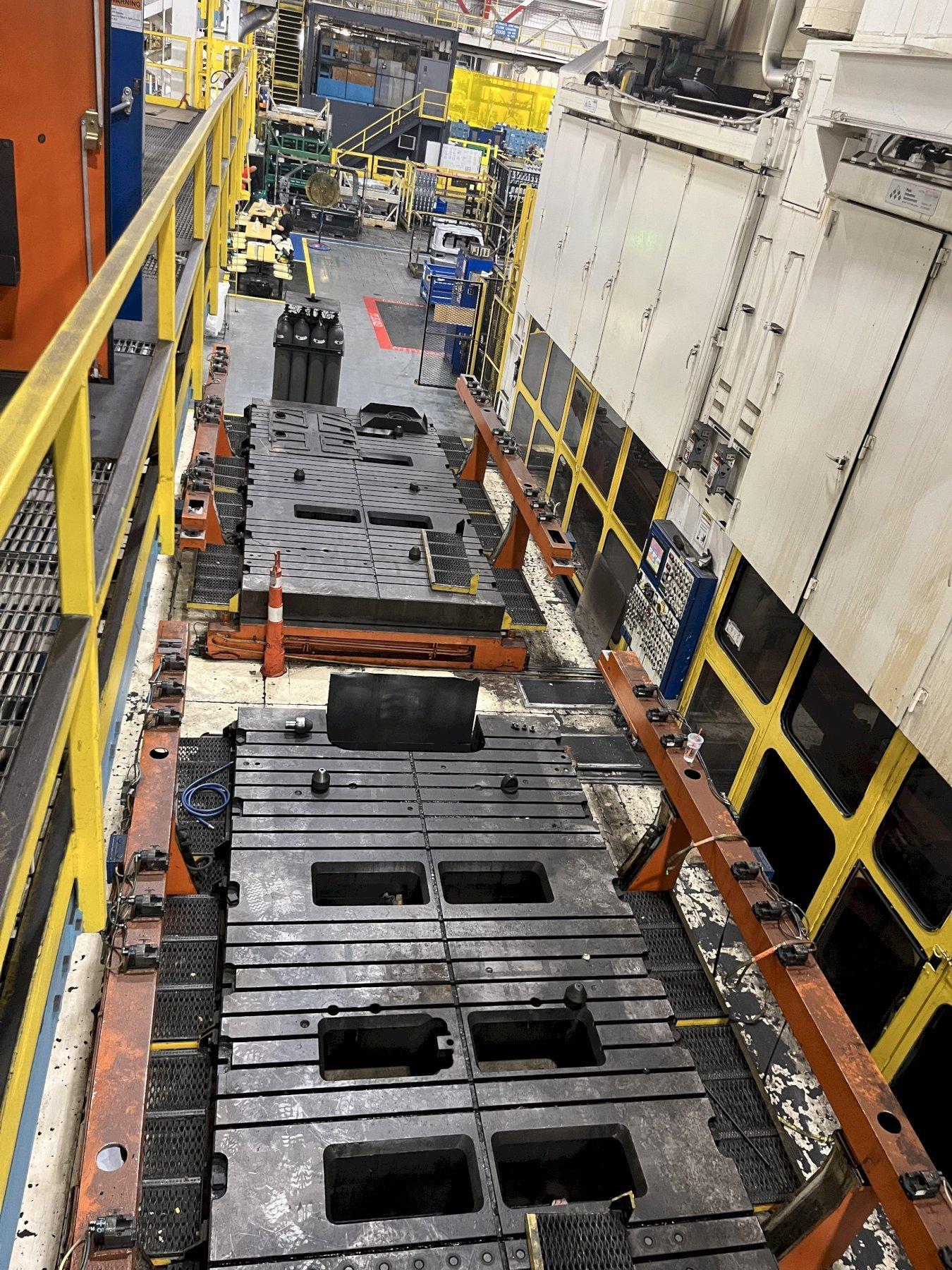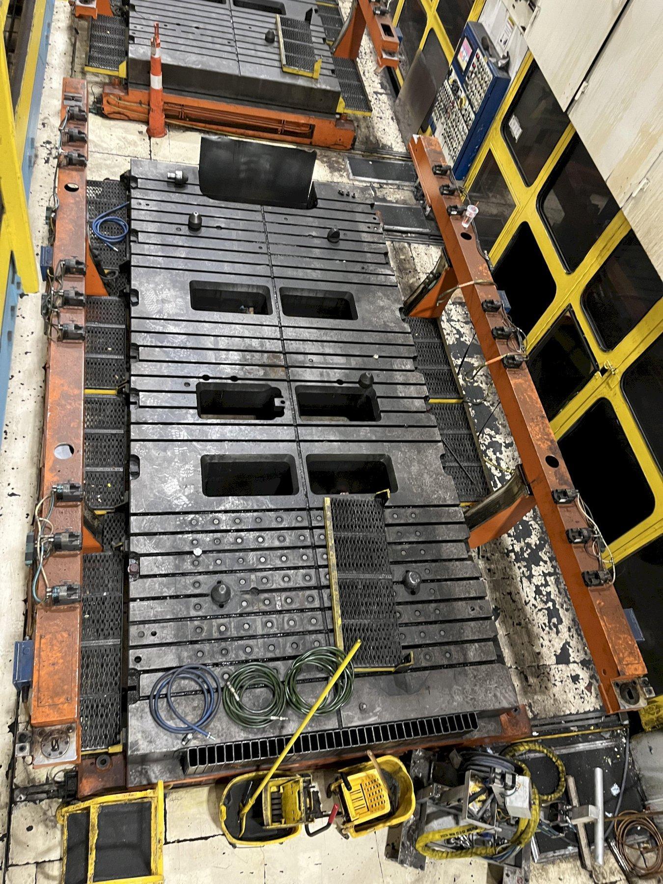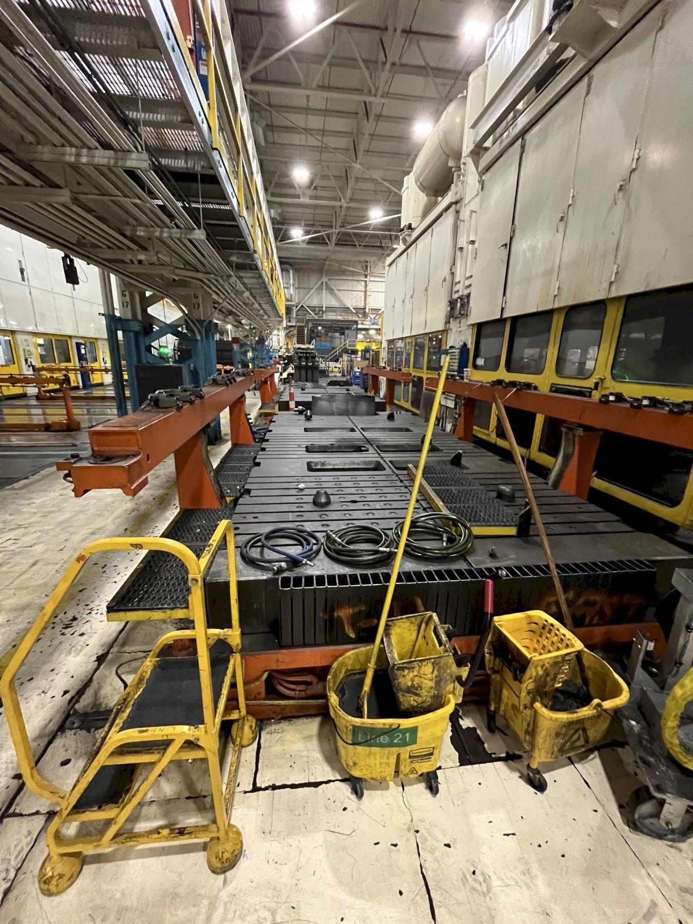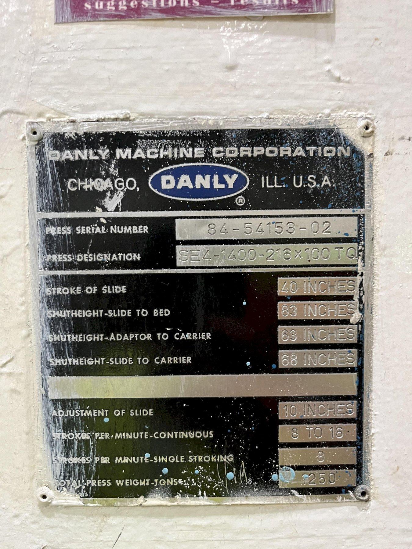 Model SE4-1400-216 x 100 TQ Straight side Eccentric 4 point double crank transfer press 40" Stroke of slide 83" Shut Height to bed 63" Shut Height -Adaptor to carrier 68" Shut Height-Slide to Carrier 10" Adjustment of slide 8-16 Strokes per Minute continuous speed 8. Strokes per minute Single stroking 216" X 100" bed area