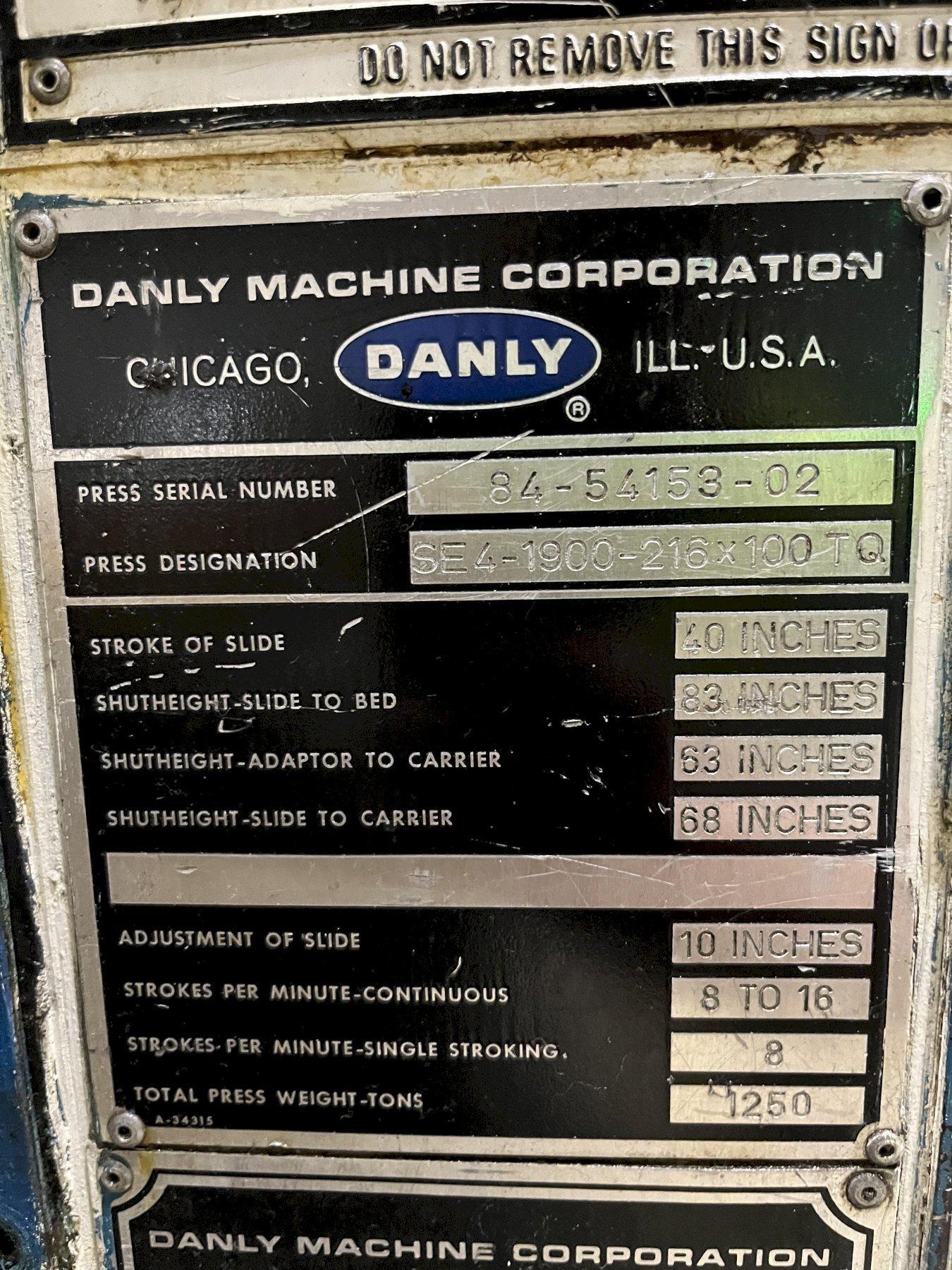 Model SE4-1900-216 x 100 TQ Straight side Eccentric 4 point double crank transfer press 40" Stroke of slide 83" Shut Height to bed 63" Shut Height -Adaptor to carrier 68" Shut Height-Slide to Carrier 10" Adjustment of slide 8-16 Strokes per Minute continuous speed 8. Strokes per minute Single stroking 216" X 100" bed area